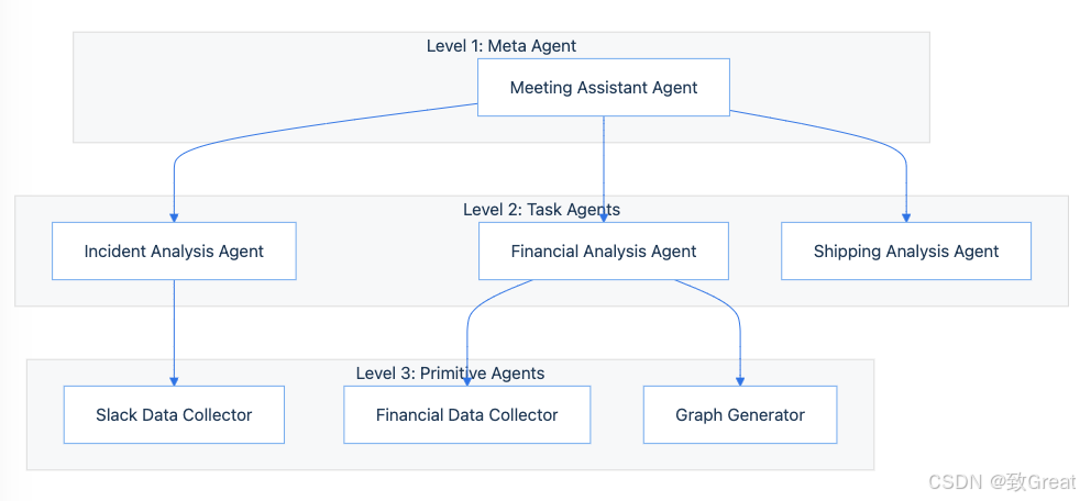 图片显示三个Agent级别的分层流程图。在第 1 级(元Agent)中,顶部有一个会议助理Agent。它连接到第 2 级(任务Agent),其中包含三个Agent:事件分析Agent、财务分析Agent和运输分析Agent。在第 3 级(原始Agent)中,事件分析Agent连接到 Slack 数据收集器,而财务分析Agent连接到财务数据收集器和图形生成器。每个级别都通过背景阴影清晰地分隔开来。