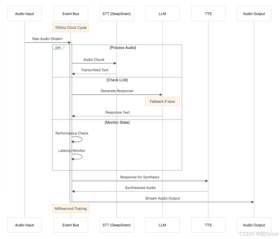 序列图显示了 RealChar 系统中音频的并行处理。该图显示了六个组件之间的交互:音频输入、事件总线、STT(DeepGram)、LLM、TTS 和音频输出。事件总线以 100 毫秒的时钟周期运行,并协调三个并行过程:通过语音转文本进行音频处理、LLM 响应生成(带回退选项)和系统监控。音频从输入流出,经过转录、语言模型处理、语音合成,最后流向输出。整个过程以毫秒级跟踪进行跟踪。