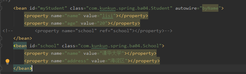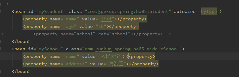 <bean id="myStudent" class="com.kunkun.spring.ba03.Student"> <constructor-arg name="name" value="李四lisi"></constructor-arg> <constructor-arg name="age" value="12"></constructor-arg> <constructor-arg name="school" ref="school"></constructor-arg> </bean> <bean id="school" class="com.kunkun.spring.ba03.School"> <property name="name" value="北京大学"></property> <property name="address" value="海淀区"></property> </bean>