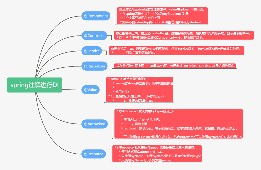 主要有以上七个注解:其中前四个是用来在spring容器中创建bean的,下面三个是用来对属性进行赋值的。