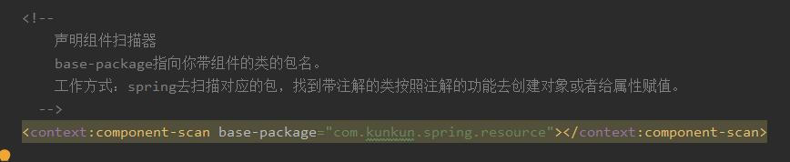 3、在spring配置文件中,加一个组件扫描器的标签,说明注解在你项目中的位置。