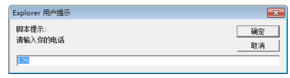 1 var a = prompt("请输入你的电话","139"); 2 alert("哈哈,你输入的电话是" + a); |