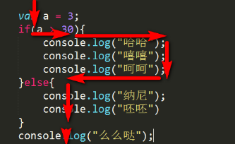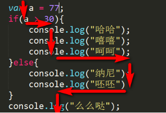1 var a = 355; 2 if(a > 30){ 3 console.log("哈哈"); 4 console.log("嘻嘻"); 5 console.log("呵呵"); 6 }else{ 7 console.log("纳尼"); 8 console.log("呸呸") 9 } 10 console.log("么么哒"); /*一定会执行,在if结构体外面*/ |