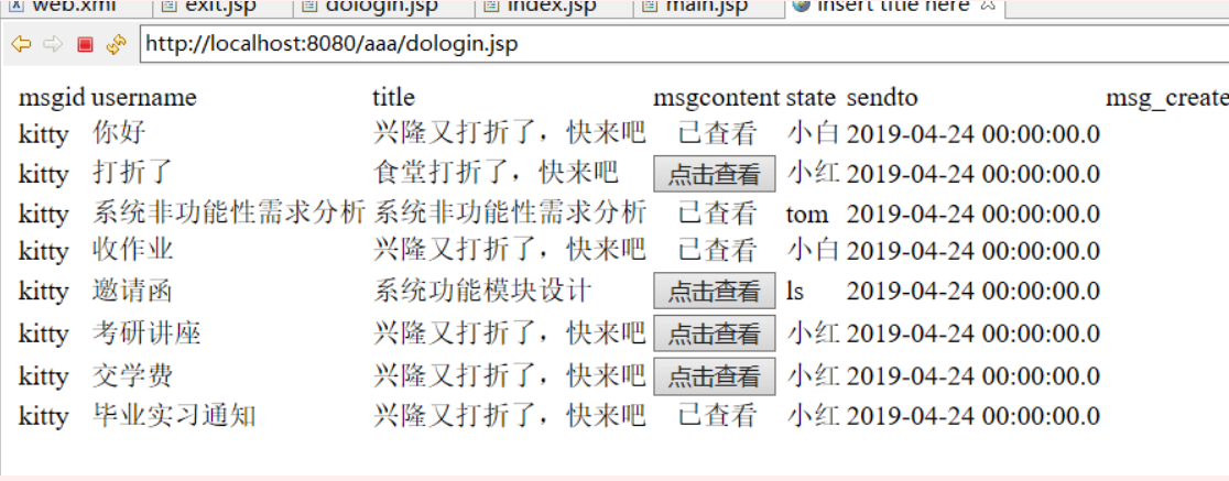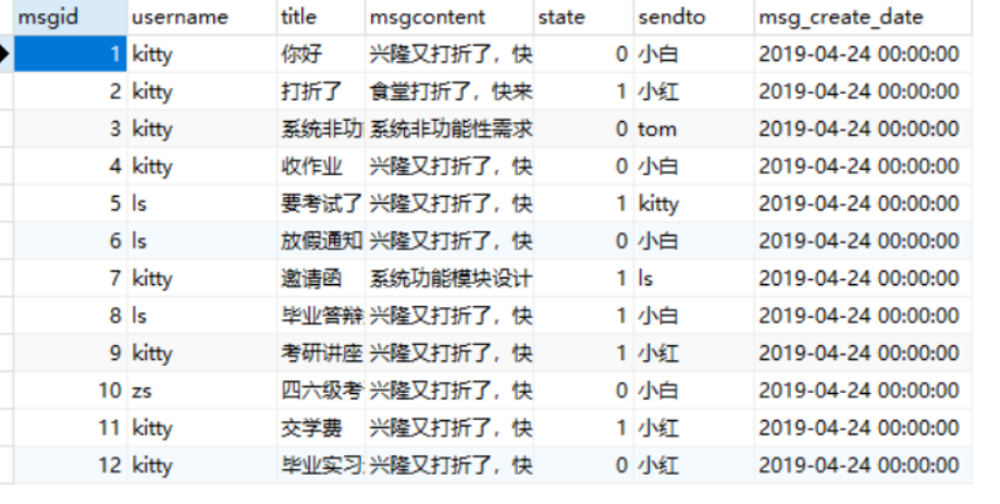 values('kitty','毕业实习通知','兴隆又打折了,快来吧',0,'小红','2019-04-24');