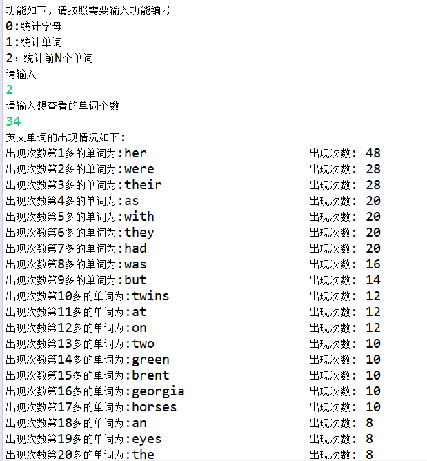 1 package main; 2 3 import java.io.BufferedReader; 4 import java.io.File; 5 import java.io.FileInputStream; 6 import java.io.FileOutputStream; 7 import java.io.IOException; 8 import java.io.InputStreamReader; 9 import java.io.OutputStreamWriter; 10 import java.text.DecimalFormat; 11 import java.util.HashMap; 12 import java.util.Map; 13 import java.util.Scanner; 14 15 16 17 18 public class demo { 19 public static Map<String,Integer> map1=new HashMap<String,Integer>(); 20 static int g_Wordcount[]=new int[27]; 21 static int g_Num[]=new int[27]; 22 23 static String []unUse=new String[] { 24 "it", 25 "in", 26 "to", 27 "of", 28 "the", 29 "and", 30 "that", 31 "for" 32 }; 33 34 public static void main(String arg[]) { 35 menu(); 36 37 } 38 public static void menu() 39 { 40 Scanner cin=new Scanner(System.in); 41 int command; 42 while (true) 43 { 44 45 System.out.println("功能如下,请按照需要输入功能编号"); 46 System.out.println("0:统计字母"); 47 System.out.println("1:统计单词"); 48 System.out.println("2:统计前N个单词"); 49 System.out.println("请输入"); 50 command=cin.nextInt(); 51 int N; 52 if ((command==0)||(command==1)||(command==2)) 53 { 54 switch (command) 55 { 56 case 0: 57 mathmaticnumber(); 58 break; 59 case 1: 60 daoruFiles("src/newAnalysis.txt","tongji"); 61 break; 62 case 2: 63 System.out.println("请输入想查看的单词个数"); 64 N=cin.nextInt(); 65 NdaoruFiles("src/newAnalysis.txt","tongji",N); 66 break; 67 68 default:System.out.println("输入错误"); 69 break; 70 } 71 break;// 结束循环 72 } else 73 { 74 System.out.println("错误,请重新输入");// 继续循环,即跳转到上一步 75 } 76 } 77 78 } 79 private static void NdaoruFiles(String a, String dc, int N) 80 { 81 map1.clear(); 82 try { 83 daoru(a); 84 } catch (IOException e) { 85 // TODO 自动生成的 catch 块 86 e.printStackTrace(); 87 88 } 89 String sz[]; 90 Integer num[]; 91 final int MAXNUM=N; //统计的单词出现最多的前n个的个数 92 93 for(int i=0;i<g_Wordcount.length;i++) 94 { 95 g_Wordcount[i]=0; 96 g_Num[i]=i; 97 } 98 99 sz=new String[MAXNUM+1]; 100 num=new Integer[MAXNUM+1]; 101 demo demo=new demo(); 102 int account =1; 103 //Vector<String> ve1=new Vector<String>(); 104 try { 105 daoru(a); 106 } catch (IOException e) { 107 // TODO 自动生成的 catch 块 108 e.printStackTrace(); 109 } 110 System.out.println("英文单词的出现情况如下:"); 111 int g_run=0; 112 113 for(g_run=0;g_run<MAXNUM+1;g_run++) 114 { 115 account=1; 116 for(Map.Entry<String,Integer> it : demo.map1.entrySet()) 117 { 118 if(account==1) 119 { 120 sz[g_run]=it.getKey(); 121 num[g_run]=it.getValue(); 122 account=2; 123 } 124 if(account==0) 125 { 126 account=1; 127 continue; 128 } 129 if(num[g_run]<it.getValue()) 130 { 131 sz[g_run]=it.getKey(); 132 num[g_run]=it.getValue(); 133 } 134 //System.out.println("英文单词: "+it.getKey()+" 该英文单词出现次数: "+it.getValue()); 135 } 136 demo.map1.remove(sz[g_run]); 137 } 138 int g_count=1; 139 String tx1=new String(); 140 String tx2=new String(); 141 for(int i=0;i<g_run;i++) 142 { 143 if(sz[i]==null) 144 continue; 145 if(sz[i].equals("")) 146 continue; 147 tx1+="出现次数第"+(g_count)+"多的单词为:"+sz[i]+"\t\t\t出现次数: "+num[i]+"\r\n"; 148 System.out.println("出现次数第"+(g_count)+"多的单词为:"+sz[i]+"\t\t\t出现次数: "+num[i]); 149 g_count++; 150 } 151 try { 152 daochu(tx1,dc+"2.txt"); 153 } catch (IOException e) { 154 // TODO 自动生成的 catch 块 155 e.printStackTrace(); 156 } 157 158 //------------------------------ 159 int temp=g_Wordcount[0]; 160 int numtemp=0; 161 for(int i=0;i<26;i++) 162 { 163 for(int j=i;j<26;j++) 164 { 165 if(g_Wordcount[j]>g_Wordcount[i]) 166 { 167 temp=g_Wordcount[i]; 168 g_Wordcount[i]=g_Wordcount[j]; 169 g_Wordcount[j]=temp; 170 numtemp=g_Num[i]; 171 g_Num[i]=g_Num[j]; 172 g_Num[j]=numtemp; 173 174 } 175 } 176 } 177 int sum=0; 178 for(int i=0;i<26;i++) 179 { 180 sum+=g_Wordcount[i]; 181 } 182 for(int i=0;i<26;i++) 183 { 184 char c=(char) ('a'+g_Num[i]); 185 tx2+=c+":"+String.format("%.2f%% \r\n", (double)g_Wordcount[i]/sum*100); 186 } 187 try { 188 daochu(tx2,dc+"1.txt"); 189 } catch (IOException e) { 190 // TODO 自动生成的 catch 块 191 e.printStackTrace(); 192 } 193 194 195 } 196 public static void daoruFiles(String a,String dc) 197 { 198 map1.clear(); 199 try { 200 daoru(a); 201 } catch (IOException e) { 202 // TODO 自动生成的 catch 块 203 e.printStackTrace(); 204 205 } 206 String sz[]; 207 Integer num[]; 208 final int MAXNUM=20000; 209 210 for(int i=0;i<g_Wordcount.length;i++) 211 { 212 g_Wordcount[i]=0; 213 g_Num[i]=i; 214 } 215 216 sz=new String[MAXNUM+1]; 217 num=new Integer[MAXNUM+1]; 218 demo demo=new demo(); 219 int account =1; 220 //Vector<String> ve1=new Vector<String>(); 221 try { 222 daoru(a); 223 } catch (IOException e) { 224 // TODO 自动生成的 catch 块 225 e.printStackTrace(); 226 } 227 System.out.println("英文单词的出现情况如下:"); 228 int g_run=0; 229 230 for(g_run=0;g_run<MAXNUM+1;g_run++) 231 { 232 account=1; 233 for(Map.Entry<String,Integer> it : demo.map1.entrySet()) 234 { 235 if(account==1) 236 { 237 sz[g_run]=it.getKey(); 238 num[g_run]=it.getValue(); 239 account=2; 240 } 241 if(account==0) 242 { 243 account=1; 244 continue; 245 } 246 if(num[g_run]<it.getValue()) 247 { 248 sz[g_run]=it.getKey(); 249 num[g_run]=it.getValue(); 250 } 251 //System.out.println("英文单词: "+it.getKey()+" 该英文单词出现次数: "+it.getValue()); 252 } 253 demo.map1.remove(sz[g_run]); 254 } 255 int g_count=1; 256 String tx1=new String(); 257 String tx2=new String(); 258 for(int i=0;i<g_run;i++) 259 { 260 if(sz[i]==null) 261 continue; 262 if(sz[i].equals("")) 263 continue; 264 tx1+="出现次数第"+(g_count)+"多的单词为:"+sz[i]+"\t\t\t出现次数: "+num[i]+"\r\n"; 265 System.out.println("出现次数第"+(g_count)+"多的单词为:"+sz[i]+"\t\t\t出现次数: "+num[i]); 266 g_count++; 267 } 268 try { 269 daochu(tx1,dc+"2.txt"); 