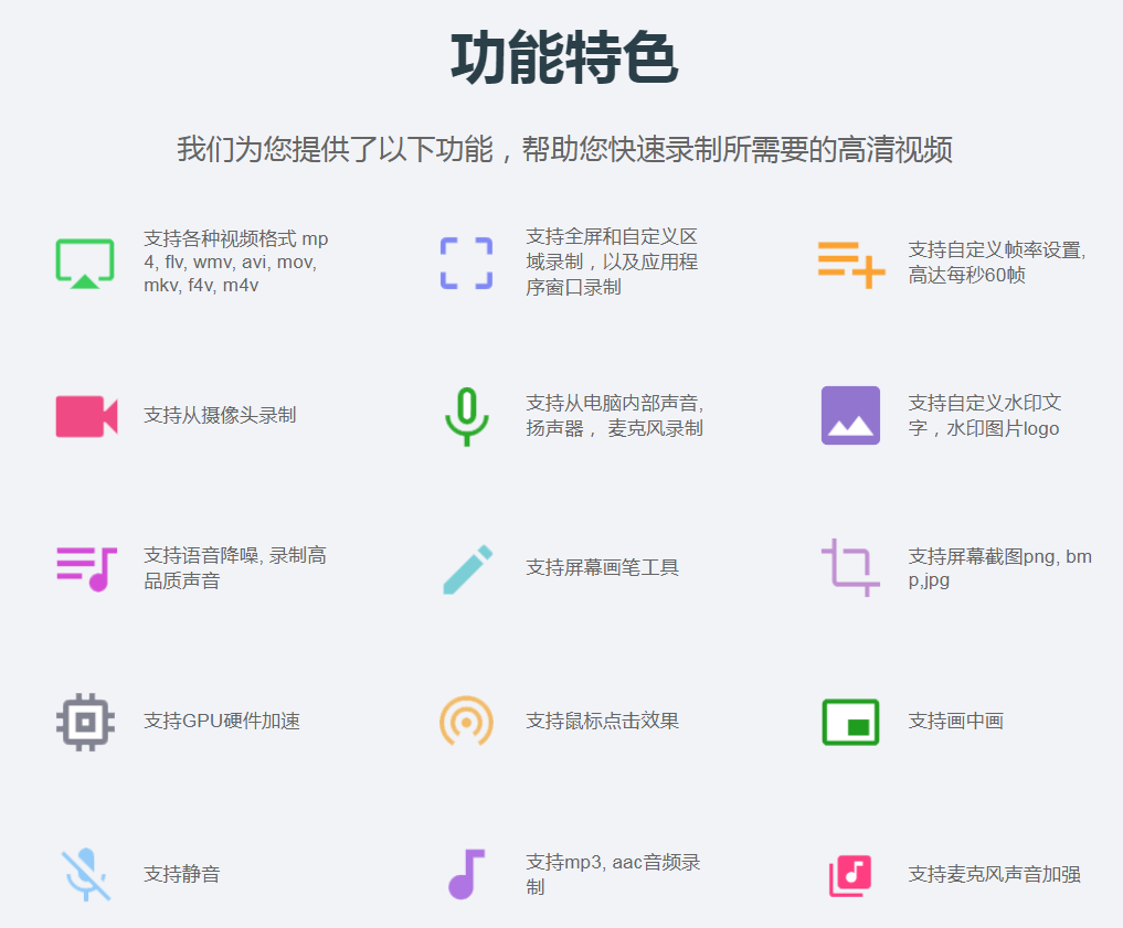 QVE屏幕录制是高清视频录制,简单易用,低CPU占用率,高清流畅画质 , 音画同步录制,无噪声 , 高品质声音,文件占用体积小,每秒高达60帧,超长时间录制,支持自定义水印,支持语音降噪,支持屏幕截图,支持GPU硬件加速,支持鼠标点击效果,支持静音 ,支持鼠标跟随录制 ,支持GIF动画录制,支持从电脑内部声音和麦克风录制,支持从摄像头录制,支持全屏和自定义区域录制等