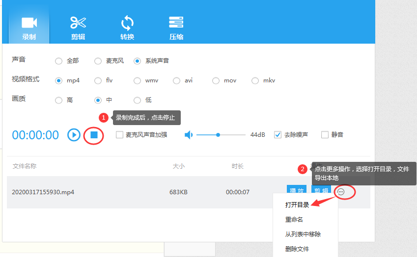 3,第三步,录制的内容结束后,点开qve屏幕录制主界面,点击停止,列表会显示录制的文件, 时长,大小,在点击更多操作按钮,选择打开目录,录制的文件就在打开的目录下.