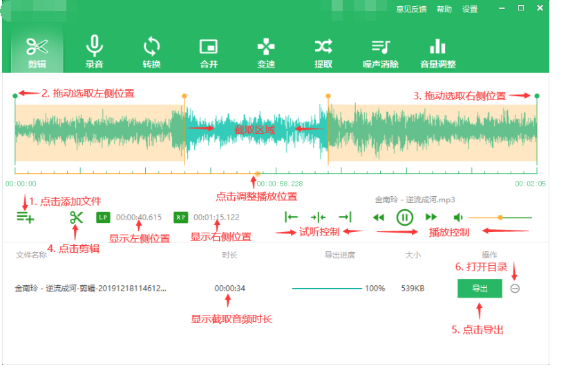 1.打开软件,添加文件-->2.拖动选取左侧位置-->3.拖动选取右侧位置-->4.点击剪辑--5.点击导出--> 6.进度百分百后,打开目录,剪辑的文件就在打开的目录下.