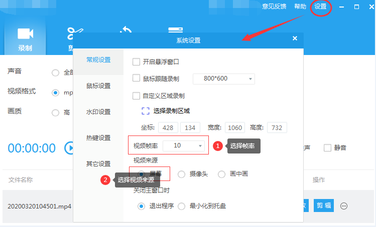 根据自身需求选择对应的视频参数,包括:视频格式、清晰度、视频帧率、鼠标指针等等;