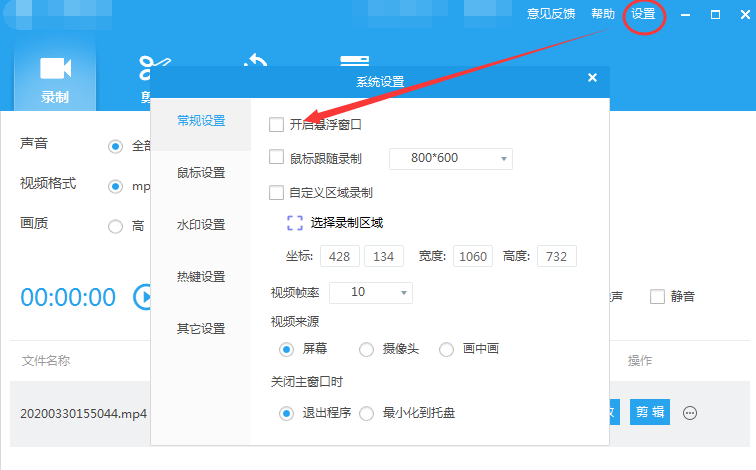 1.步骤一,首先下载好软件安装打开,点击设置,勾选开启悬浮窗,录屏开始后方便暂停和结束,勾选关闭回到主界面.