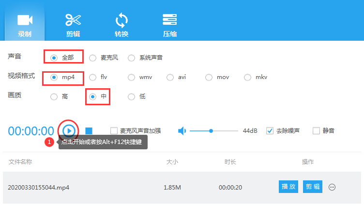 2.步骤二,选择声音来源,默认是勾选全部,也可以根据自己不同需求勾选,选择录制后输出格式,默认mp4 ,选择录制画质,默认即可,点击开始录制或者按组合键,录屏开始,电脑右上角会出现软件的悬浮窗》