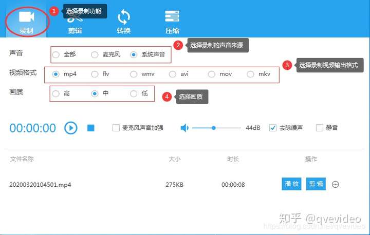 1.第一步,打开QVE屏幕录制,选择录制功能–>声音来源,选麦克或者系统,也可全部,建议默认 -->视视频格式支持,mp4,flv,wmv,avi,mov,mkv,一般软件会使用默认 -->画质也默认.