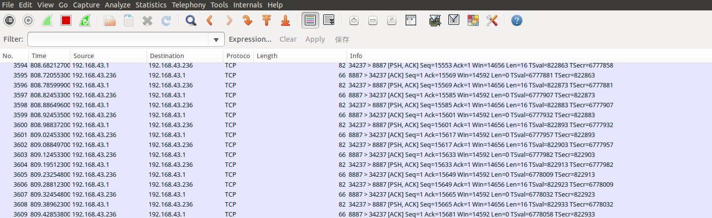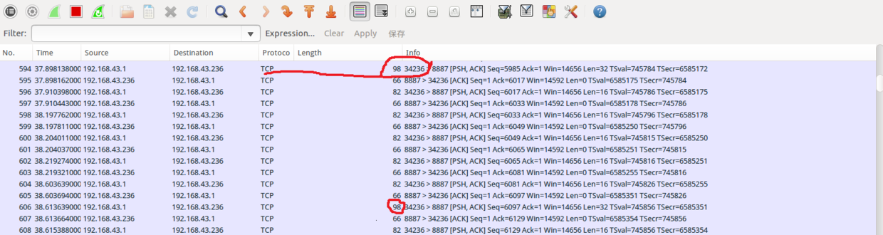 现在我写了个基于TCP的socket程序,希望AP往client端发送1000个16字节的报文。结果发现client端接收到的报文并不是每次大小都是82字节(82字节是因为有66字节的TCP和IP头等,外加16字节我自己的数据),会出现大小为98字节的数据(98字节是因为有66字节的TCP和IP头等,外加两个16字节的自己的数据)。如下图所示: