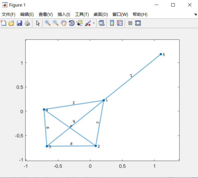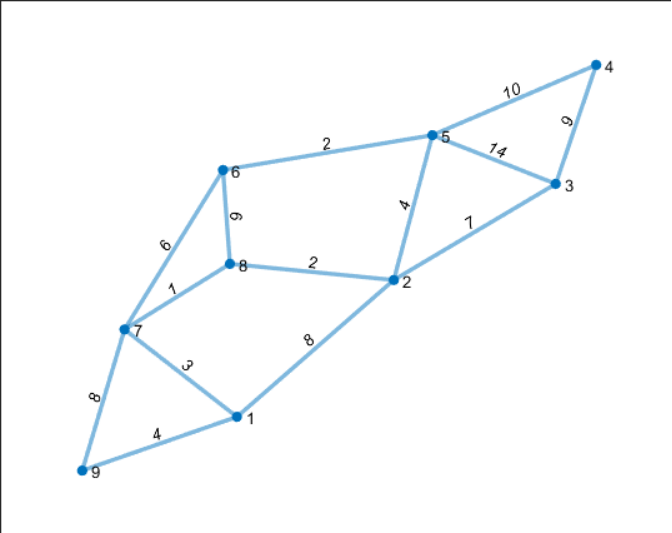 myplot = plot(G, 'EdgeLabel', G.Edges.Weight, 'linewidth', 2); %首先将图赋给一个变量