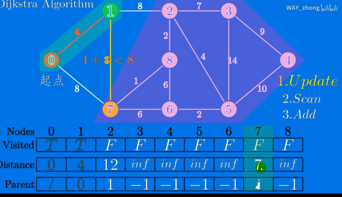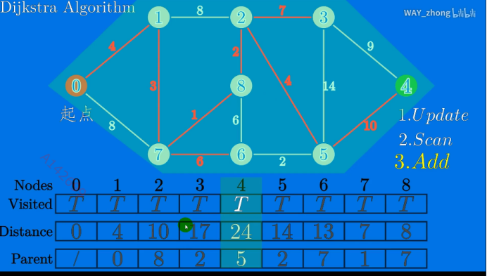 Distance一行表现出每个点到起点的最短距离,然后parent是到前一个节点的最短距离,依次往回推,可以求出最短的路径。