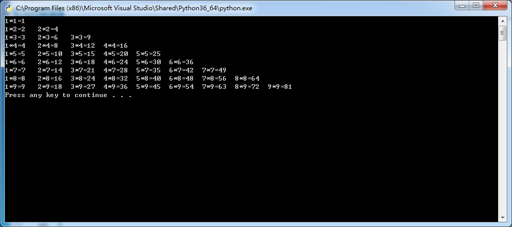 row = 1while row <=9: num =1 while num<=row: print(str(num)+"*"+str(row)+"="+str(num*row),end="\t") num+=1 print() row+=1