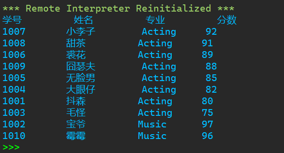 with open("C:/Users/Lenovo/Desktop/data7.csv",'r',encoding='gbk')as f: title=[f.readline()] data=f.readlines() def getscore(ls): return ls[len(ls)-1] data=[line.strip('\n').split(',')for line in data] data.sort(key=lambda x:(x[2],-int(x[3]))) with open('data7_processed.csv', 'w', encoding = 'gbk') as f: f.write(','.join(title)) for item in data: f.write(','.join(item) + '\n') title=title[0].strip('\n').split(',') print('{:<10}'.format(title[0]),'{:<10}'.format(title[1]),'{:<10}'.format(title[2]),'{:<15}'.format(title[3])) for i in data: print('{:<10}'.format(i[0]), '{:<10}'.format(i[1]), '{:<10}'.format(i[2]), '{:<10}'.format(i[3]))