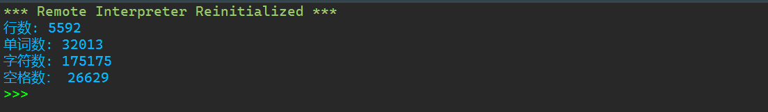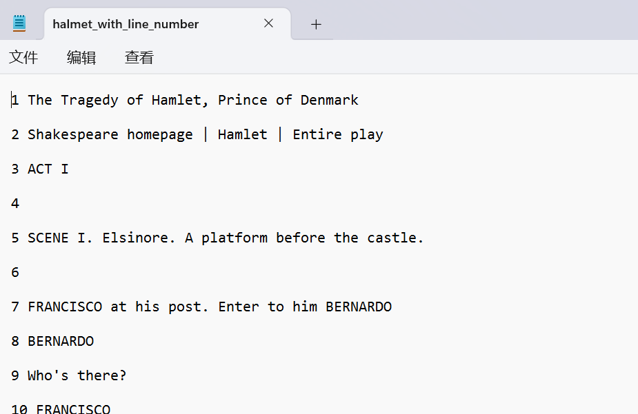 with open("C:/Users/Lenovo/Desktop/hamlet.txt",'r',encoding='utf-8')as f: data1=f.readlines() print('行数:',len(data1)) with open("C:/Users/Lenovo/Desktop/hamlet.txt",'r',encoding='utf-8')as f: data2=f.read() print('单词数:',len(data2.split())) isalpha=0 others=0 for i in data2: if i.isalpha(): isalpha+=1 else: others+=1 print('字符数:',isalpha+others) print('空格数:',data2.count(' ')) with open('halmet_with_line_number.txt','w',encoding='utf-8')as f: data3=data2.splitlines() data4=[] for i in range(len(data3)): data4.append(f'{i+1} '+data1[i]+'\n') f.writelines(data4)