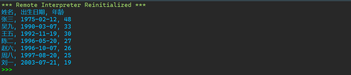 def is_valid(id): if len(id)==18 and id[:-1].isdigit() and (id[-1].isdigit() or id[-1]=='X'): return True else: return False with open("C:/Users/Lenovo/Desktop/data9_id.txt",'r',encoding='utf-8')as f: data=f.readlines() data.remove(data[0]) data0=[i.strip('\n').split(',') for i in data] data1=[] for i in data0: if is_valid(i[1])==True: i[1]=i[1][6:14] data1.append(i) import datetime t=datetime.datetime.now() y=t.strftime('%Y%m%d') for i in data1: i.append(str(int(y)-int(i[1][0:8]))) data2=sorted(data1,key=lambda x:-int(x[2])) print('姓名, 出生日期, 年龄') for i in data2: i[1]=i[1][0:4]+'-'+i[1][4:6]+'-'+i[1][6:8] i[2]=i[2][0:2] print(', '.join(i))