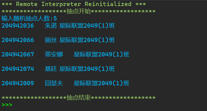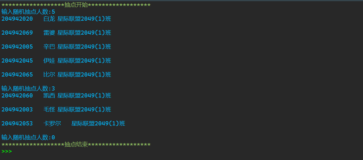 print(f"{'抽点开始':*^40}") import random as r with open("C:/Users/Lenovo/Desktop/data10_stu.txt",'r',encoding = 'utf-8') as f: stu = f.readlines() def func(n): stu_list = [] while True: if n != 0: i = r.randint(0,len(stu)-1) if stu[i] not in stu_list: stu_list.append(stu[i]) print(stu[i]) n -= 1 else: pass if n==0: break while True: n = int(input('输入随机抽点人数:')) if n != 0: func(n) else: print(f"{'抽点结束':*^40}") break