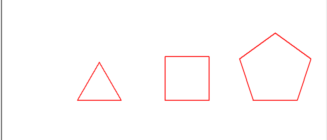 from turtle import * def move(x,y): penup() goto(x,y) pendown() def draw(n,size=100): for i in range(n): fd(size) left(360/n) def main(): pensize(2) pencolor('red') move(-200,0) draw(3) move(0,0) draw(4) move(200,0) draw(5) hideturtle() done() main()