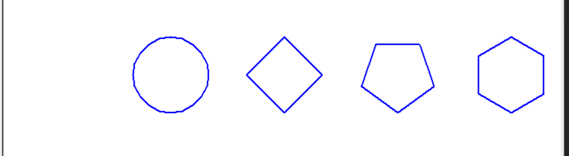 from turtle import * def moveto(x,y): penup() goto(x,y) pendown() def main(): pensize(2) pencolor('blue') moveto(-150,0) circle(50) moveto(0,0) circle(50,steps = 4) moveto(150,0) circle(50,steps = 5) moveto(300,0) circle(50,steps = 6) hideturtle() done() main()