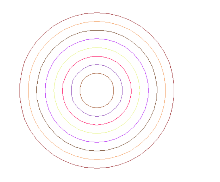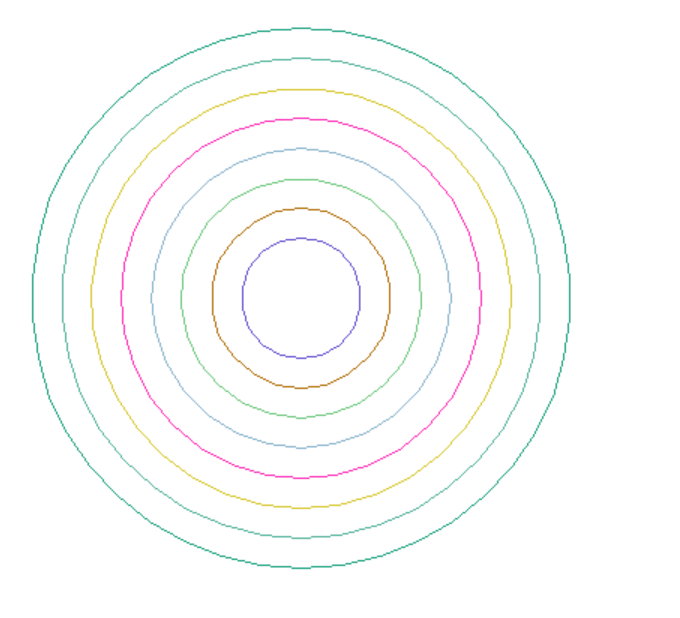 from turtle import * from random import random def moveto(x,y): penup() goto(x,y) pendown() def gen_color(): return tuple((random() for i in range(3))) def main(): setup(800,600) radius=180 offset=20 for i in range(8): moveto(0,-radius) color(gen_color()) begin_fill() circle(radius) radius-=offset hideturtle() done() main()