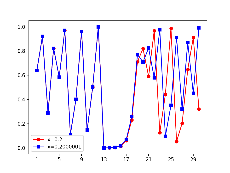 from matplotlib import pyplot as plt def func(x): return 4*x*(1-x) def gen_lst(x,n): ans = [] for i in range(n): t = func(x) ans.append(t) x = t return ans def main(): n=30 lst1 = gen_lst(0.2,n) lst2 = gen_lst(0.2000001,n) x=list(range(1,31)) plt.plot(x,lst1,'ro-',x,lst2,'bs-') plt.xticks(list(range(1,31,4))) plt.legend(['x=0.2','x=0.2000001']) plt.show() main()