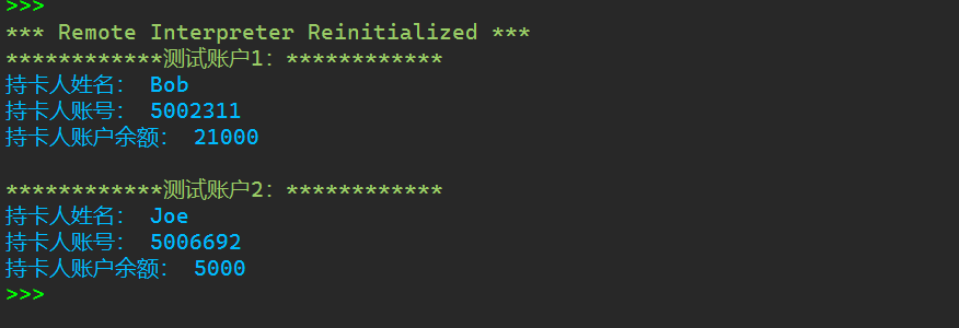 class Account: def __init__(self, name, account_number, initial_amount = 10): self._name=name self._card_no=account_number self._balance=initial_amount def deposit(self,amount): self._balance+=amount def withdraw(self,amount): if self._balance<amount: print('余额不足') return self._balance-=amount def info(self): print('持卡人姓名:',self._name) print('持卡人账号:',self._card_no) print('持卡人账户余额:',self._balance) def get_balance(self): return self._balance def main(): print('测试账户1:'.center(30,'*')) a1=Account('Bob','5002311',20000) a1.deposit(5000) a1.withdraw(4000) a1.info() print() print('测试账户2:'.center(30,'*')) a2=Account('Joe','5006692',20000) a2.withdraw(10000) a2.withdraw(5000) a2.info() if __name__=='__main__': main()