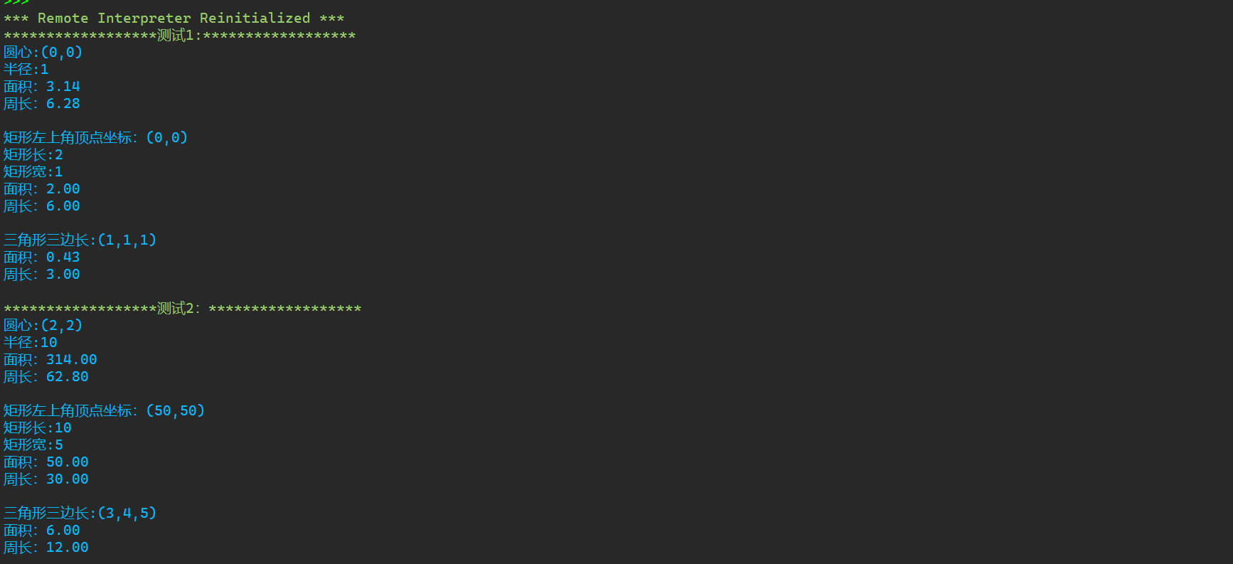 class Shape: def info(self): pass def area(self): pass def perimeter(self): pass class Rect(Shape): def __init__(self,x=0,y=0,length=2,width=1): self._x=x self._y=y self._width=width self._length=length def info(self): print(f'矩形左上角顶点坐标:({self._x},{self._y})') print(f'矩形长:{self._length}') print(f'矩形宽:{self._width}') def area(self): return self._length*self._width def perimeter(self): return (self._length+self._width)*2 class Circle(Shape): def __init__(self,x=0,y=0,radius=1): self._x=x self._y=y self._r=radius def info(self): print(f'圆心:({self._x},{self._y})') print(f'半径:{self._r}') def area(self): return 3.14*self._r*self._r def perimeter(self): return 2*3.14*self._r class Triangle(Shape): def __init__(self,a=1,b=1,c=1): self._a,self._b,self._c=a,b,c def info(self): print(f'三角形三边长:({self._a},{self._b},{self._c})') def area(self): s=(self._a+self._b+self._c)/2 ans=(s*(s-self._a)*(s-self._b)*(s-self._c))**0.5 return ans def perimeter(self): return(self._a+self._b+self._c) def main(): print('测试1:'.center(40,'*')) shapes_lst1=[Circle(),Rect(),Triangle()] for t in shapes_lst1: t.info() print(f'面积:{t.area():.2f}') print(f'周长:{t.perimeter():.2f}') print() print('测试2:'.center(40,'*')) shapes_lst2=[Circle(x=2,y=2,radius=10), Rect(x=50,y=50,length=10,width=5), Triangle(a=3,b=4,c=5)] for t in shapes_lst2: t.info() print(f'面积:{t.area():.2f}') print(f'周长:{t.perimeter():.2f}') print() if __name__=='__main__': main()