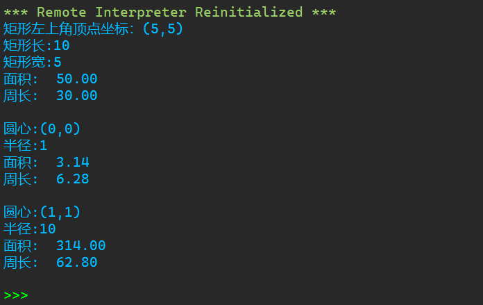 from shape import Rect, Circle shape_lst = [Rect(5, 5, 10, 5), Circle(), Circle(1, 1, 10)] for i in shape_lst: i.info() print(f'面积: {i.area(): .2f}') print(f'周长: {i.perimeter(): .2f}') print()