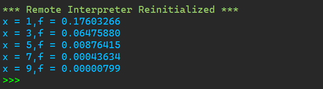 from math import * m = 0 s = 2 def func(x): return 1/(sqrt(2*pi)*s)*(exp((-0.5)*((x-m)/s)**2)) print(f'x = 1,f = {func(1):.8f}') print(f'x = 3,f = {func(3):.8f}') print(f'x = 5,f = {func(5):.8f}') print(f'x = 7,f = {func(7):.8f}') print(f'x = 9,f = {func(9):.8f}')