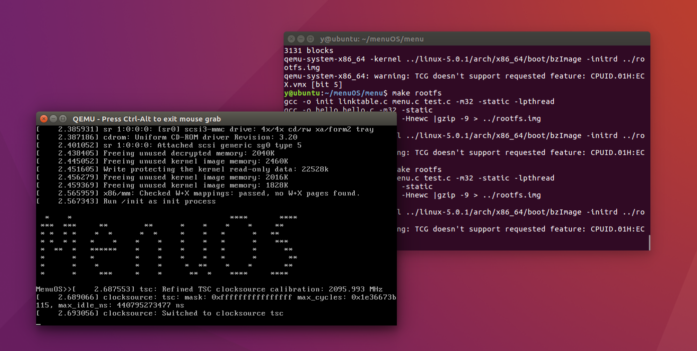 qemu-system-i386 -kernel ../linux-5.0.1/arch/x86/boot/bzImage -initrd ../rootfs.img
