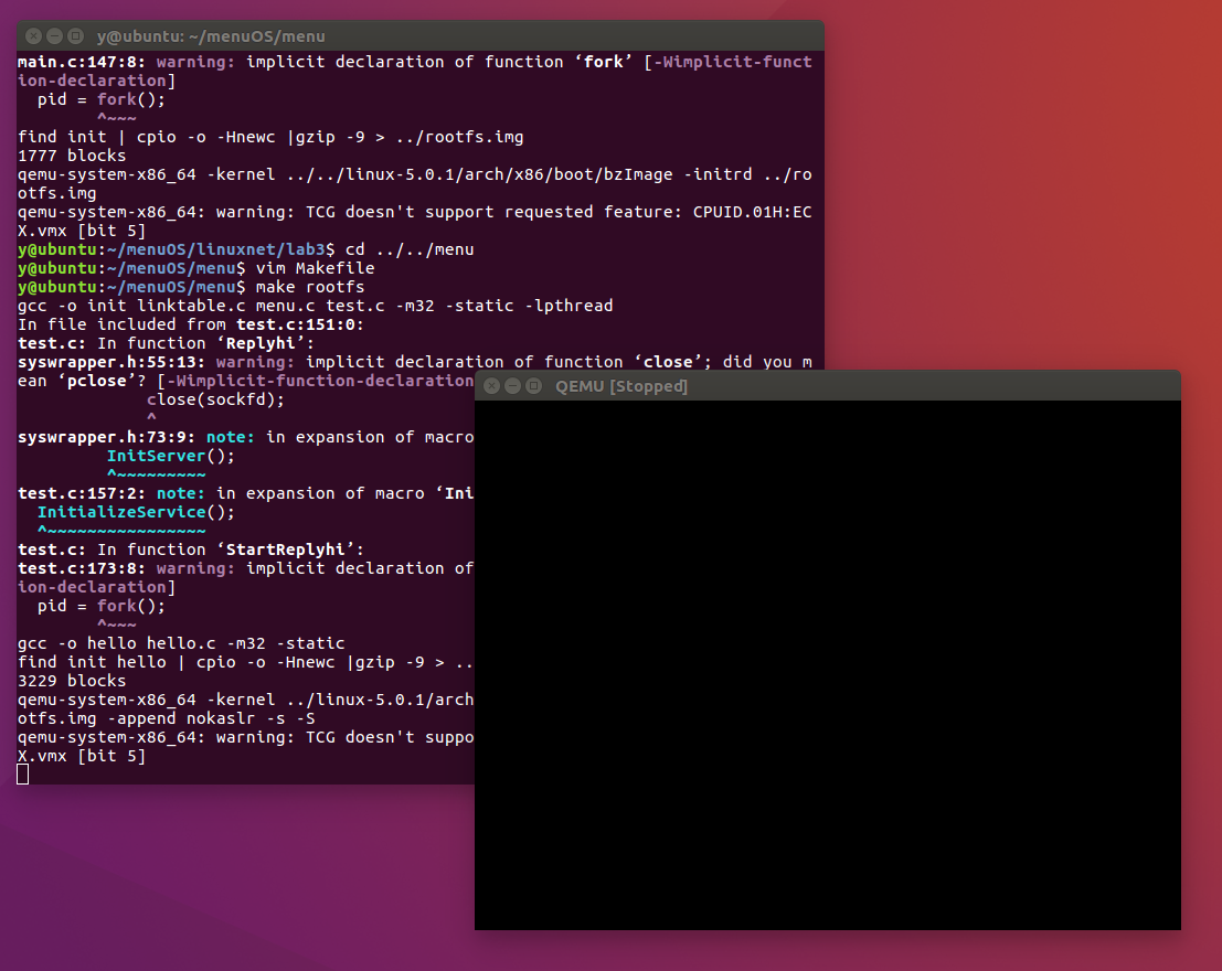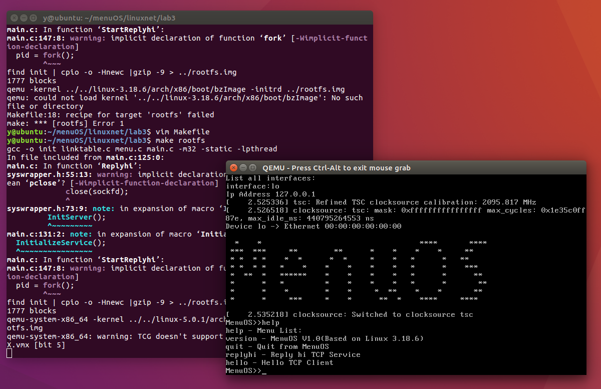 cd ~/your menu cd linuxnet/lab3 //lab3 需要修改Makefile vim Makefile //将 //qemu -kernel ../../linux-3.18.6/arch/x86/boot/bzImage -initrd ../rootfs.img //修改成 //qemu-system-x86_64 -kernel ../../linux-5.0.1/arch/x86/boot/bzImage -initrd ../rootfs.img make rootfs
