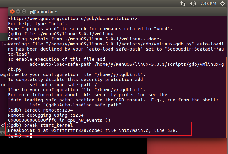 可以输入c让内核继续跑,也可以输入别的gdb命令调试