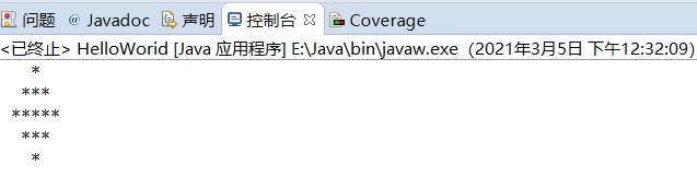 package text1; public class HelloWorid{ public static void main(String[] args){ int n = 3; printStar(n); } private static void printStar(int n){ for(int i=0;i<n;i++){ for(int j=0;j<2*n;j++){ if(j<n-i) System.out.print(" "); if(j>=n-i && j<=n+i) System.out.print("*"); } System.out.println(); } for(int i=1;i<n;i++){ System.out.print(" "); for(int j=0;j<2*n-i;j++){ if(j<i) System.out.print(" "); if(j>=i && j<2*n-i-1) System.out.print("*"); } System.out.println(); } } }