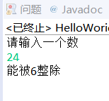 package text1; import java.util.Scanner; public class HelloWorid{ public static void main(String[] args) { Scanner input = new Scanner(System.in); System.out.println("请输入一个数"); int x = input.nextInt(); if (x % 30 == 0) { System.out.println("能被5和6整除"); } else if (x % 5 == 0) { System.out.println("能被5整除"); } else if (x % 6 == 0) { System.out.println("能被6整除"); } else if (x % 30 != 0) { System.out.println("不能被5或6整除"); } } }
