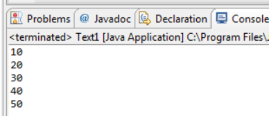 public class Text1 { /** * @param args */ public static void main(String[] args) { // TODO Auto-generated method stub int []a={10,20,30,40,50}; for(int i=0;i<5;i++){ System.out.println(a[i]); } } }