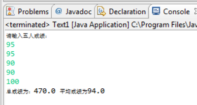 import java.util.Scanner; public class Text1 { /** * @param args */ public static void main(String[] args) { // TODO Auto-generated method stub int []a=new int[5]; double age,sum=0; Scanner input=new Scanner(System.in); System.out.println("请输入五人成绩:"); for(int i=0;i<a.length;i++){ a[i]=input.nextInt(); sum+=a[i]; } age=sum/5; System.out.println("总成绩为:"+sum+" 平均成绩为"+age); } }