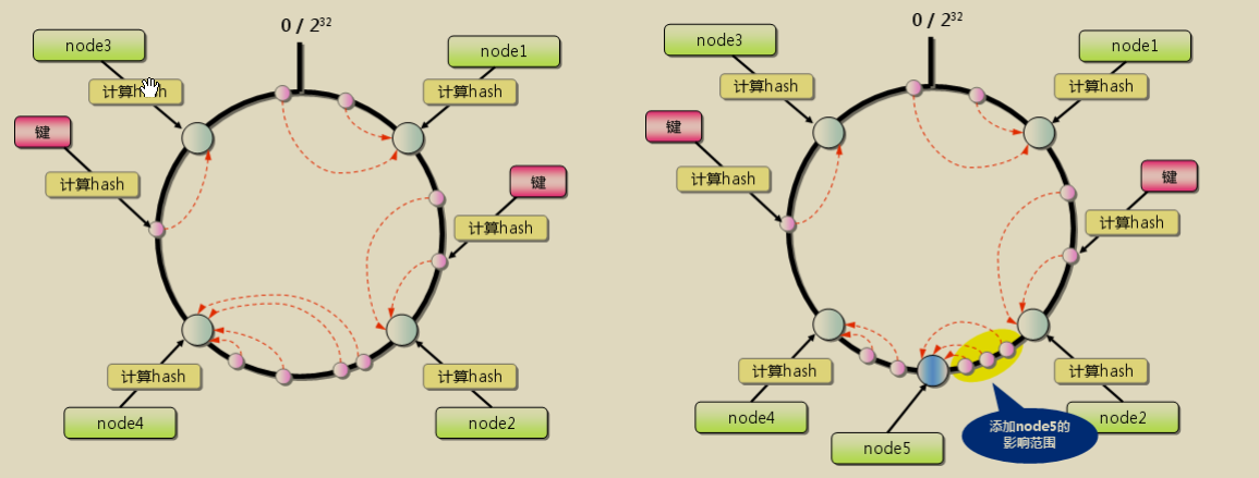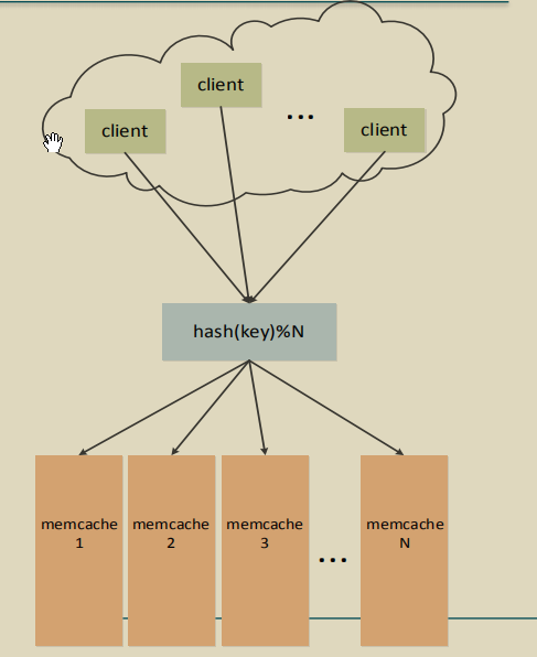 memcache本身并不是一种分布式的缓存系统,它的分布式,是由访问它的客户端来实现的。一种比较简单的实现方式是根据缓存的key来进行hash,当后端有N台缓存服务器时,访问的服务器为hash(key)%N,这样可以将前端的请求均衡的映射到后端的缓存服务器,如图所示,但是,这样也会导致一个问题,一旦后端某台缓存服务器宕机,或者是由于集群压力过大,需要新增新的缓存服务器,大部分的key将会重新分布,对于高并发系统来说,这可能会演变成一场灾难,所有的请求将如洪水般疯狂的涌向后端的数据库服务器,而数据库服务器的不可用,将会导致整个应用的不可用,形成所谓的“雪崩效应”