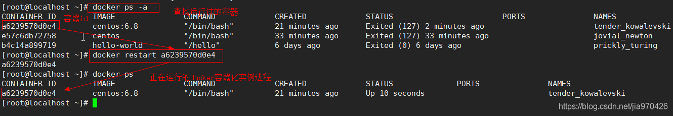 a6239570d0e4 centos:6.8 "/bin/bash" 11 minutes ago Up 11 minutes tender_kowalevski