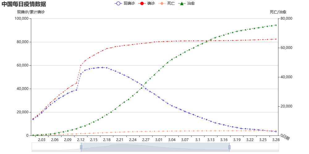 1 import pandas as pd 2 from pyecharts.charts import Line 3 from pyecharts import options as opts 4 from pyecharts.globals import ThemeType 5 6 def plot_chinaDayData()-> Line: 7 data = pd.read_csv('data\chinaDayData.csv') 8 df = pd.DataFrame(data) 9 #数据 10 date=df.iloc[:, 1].tolist() 11 nowconfirm=df.iloc[:, 3].tolist() 12 confirm=df.iloc[:, 2].tolist() 13 dead=df.iloc[:,4].tolist() 14 heal=df.iloc[:, 5].tolist() 15 date=[str(i) for i in date] 16 17 line=( 18 Line(init_opts=opts.InitOpts(width="1000px", height="500px")) 19 .add_xaxis(date) 20 .add_yaxis( 21 "现确诊", 22 nowconfirm, 23 linestyle_opts=opts.LineStyleOpts(color='blue',width=1, type_="dashed"), 24 yaxis_index=0, 25 symbol_size=3, 26 itemstyle_opts=opts.ItemStyleOpts( 27 color="blue" 28 ), 29 ) 30 .add_yaxis( 31 "确诊", 32 confirm, 33 linestyle_opts=opts.LineStyleOpts(color='red',width=1, type_="dashed"), 34 yaxis_index=0, 35 symbol='circle',#','circle' 'rect', 'roundRect', 'triangle', 'diamond', 'pin', 'arrow', 'none' 36 symbol_size=3, 37 itemstyle_opts=opts.ItemStyleOpts( 38 color="red" 39 ), 40 ) 41 .add_yaxis( 42 "死亡", 43 dead, 44 linestyle_opts=opts.LineStyleOpts(color='lightsalmon',width=1, type_="dashed"), 45 yaxis_index=1, 46 symbol='diamond', 47 symbol_size=5, 48 itemstyle_opts=opts.ItemStyleOpts( 49 color="lightsalmon" 50 ), 51 ) 52 .add_yaxis( 53 "治愈", 54 heal, 55 linestyle_opts=opts.LineStyleOpts(color='green',width=1, type_="dashed"), 56 yaxis_index=1, 57 symbol='triangle', 58 symbol_size=5, 59 itemstyle_opts=opts.ItemStyleOpts( 60 color="green" 61 ), 62 ) 63 .extend_axis( 64 yaxis=opts.AxisOpts( 65 type_="value", 66 name='死亡/治愈', 67 position="right", 68 ) 69 ) 70 .extend_axis( 71 yaxis=opts.AxisOpts( 72 type_="value", 73 split_number=10, 74 min_=2000, 75 name='现确诊/累计确诊', 76 position="left", 77 78 ) 79 ) 80 .set_global_opts( 81 title_opts=opts.TitleOpts(title="中国每日疫情数据"), 82 xaxis_opts=opts.AxisOpts(name='日期',name_location='end',name_rotate=-30), 83 yaxis_opts=opts.AxisOpts( 84 axistick_opts=opts.AxisTickOpts(is_show=True), 85 splitline_opts=opts.SplitLineOpts(is_show=True),), #y网格线 86 tooltip_opts=opts.TooltipOpts(trigger="axis"), #交互 87 datazoom_opts=opts.DataZoomOpts( 88 is_show=True, 89 type_="slider", 90 is_realtime=True, 91 range_start=20, 92 range_end=80, 93 orient="horizontal" #"vertical" 94 ) #x轴值缩放 95 ) 96 .set_series_opts( 97 label_opts=opts.LabelOpts(is_show=False),#去掉线上的数字 98 ) 99 ) 100 101 line.render(path='visual_html\中国每日疫情数据折线图.html') 102 return line