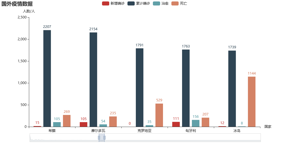 1 import pandas as pd 2 from pyecharts.charts import Bar 3 from pyecharts import options as opts 4 5 def plot_overseasBar()-> Bar: 6 data = pd.read_csv('data\overseas_data.csv') 7 df = pd.DataFrame(data) 8 9 country=df.iloc[:, 1].tolist() 10 newconfirm=df.iloc[:, 2].tolist() 11 confirm=df.iloc[:, 3].tolist() 12 heal=df.iloc[:, 4].tolist() 13 dead=df.iloc[:,5].tolist() 14 15 bar=( 16 Bar(init_opts=opts.InitOpts(width="1000px", height="500px")) 17 .add_xaxis(country) 18 .add_yaxis( 19 "新增确诊", 20 newconfirm, 21 22 ) 23 .add_yaxis( 24 "累计确诊", 25 confirm, 26 27 ) 28 29 .add_yaxis( 30 "治愈", 31 heal, 32 ) 33 .add_yaxis( 34 "死亡", 35 dead, 36 ) 37 .extend_axis( 38 yaxis=opts.AxisOpts( 39 type_="value", 40 name='人数/人', 41 position="left", 42 ) 43 ) 44 .set_global_opts( 45 title_opts=opts.TitleOpts(title="国外疫情数据"), 46 tooltip_opts=opts.TooltipOpts(trigger="axis"), 47 xaxis_opts=opts.AxisOpts(name='国家'), 48 yaxis_opts=opts.AxisOpts( 49 axistick_opts=opts.AxisTickOpts(is_show=True), 50 splitline_opts=opts.SplitLineOpts(is_show=False)), 51 52 #滚动条 53 datazoom_opts=opts.DataZoomOpts( 54 is_show=True, 55 type_="slider", 56 is_realtime=True, 57 range_start=30, 58 range_end=90, 59 orient="horizontal" 60 ) 61 ) 62 ) 63 bar.render(path='visual_html\海外疫情数据条形图.html') 64 return bar