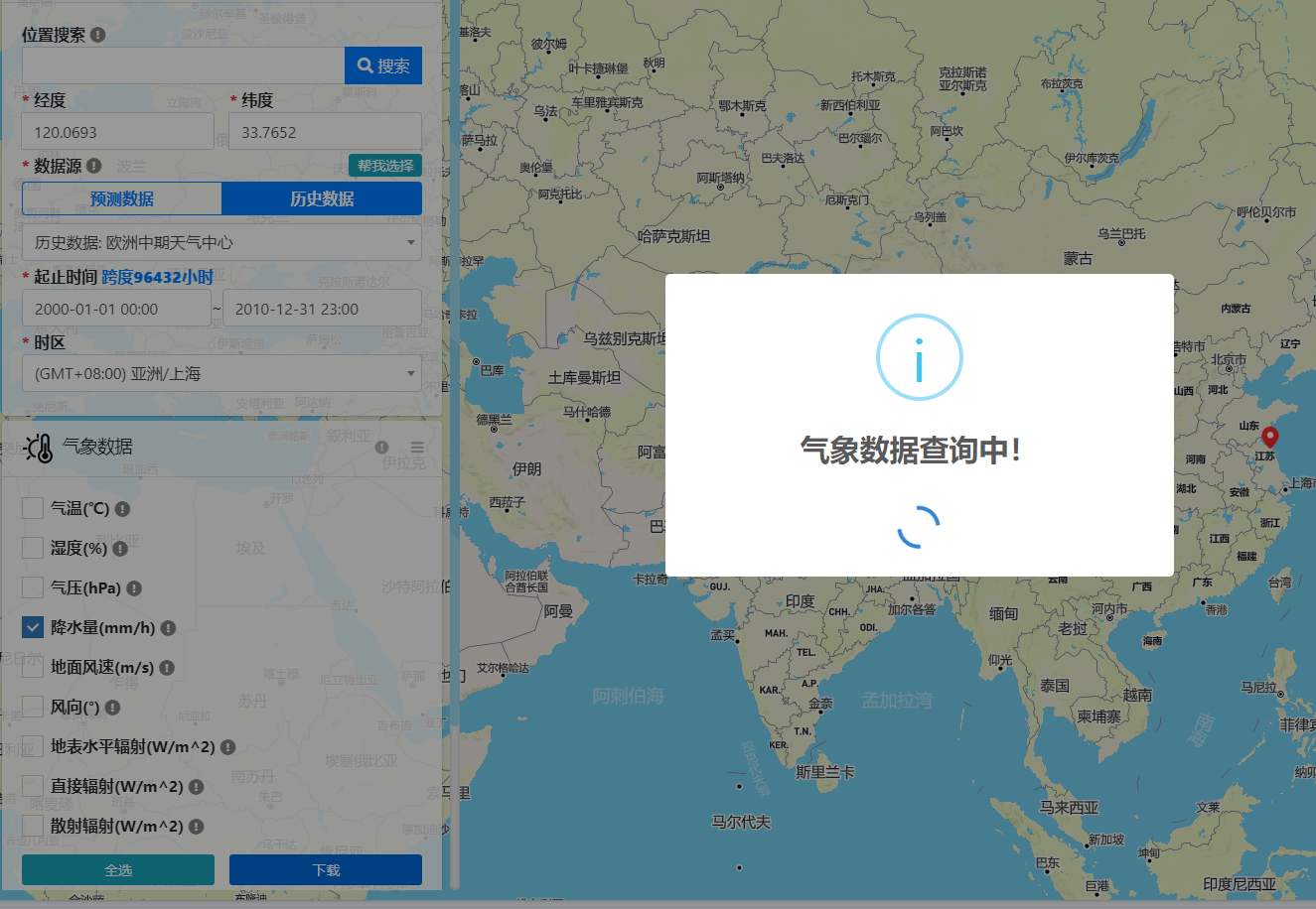 1、输入地理位置或者精确经纬度坐标,查询数据的起止时间进行设置(时区自动确定)。