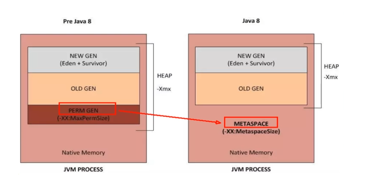 来进行调节。当内存不足时,会导致 OutOfMemoryError 异常。JDK8 彻底将永久代移除出 HotSpot JVM,将其原有的数据迁移至 Java Heap 或 Native Heap(Metaspace),取代它的是另一个内存区域被称为元空间(Metaspace)。 - 元空间(Metaspace):元空间是方法区的在 HotSpot JVM 中的实现,方法区主要用于存储类信息、常量池、方法数据、方法代码、符号引用等。元空间的本质和永久代类似,都是对 JVM 规范中方法区的实现。不过元空间与永久代之间最大的区别在于:元空间并不在虚拟机中,而是使用本地内存。,理论上取决于32位/64位系统内存大小,可以通过