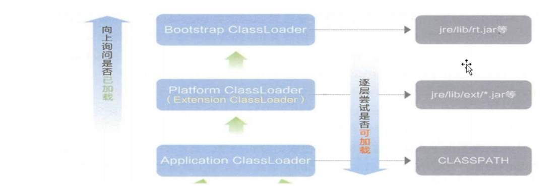 从图中可以看出,每个类加载器都有一个父加载器(有引用指向父加载器,而不是继承),在加载类时,首先check本身是否已加载,如果已加载,则返回,如果未加载,如果有父加载器则交给父加载器,如果没有父加载器则使用根加载器,如果仍没找到,则本加载器加载类,每一级加载器都执行相同的操作,这种机制称为委托机制,英语是parents delegation model