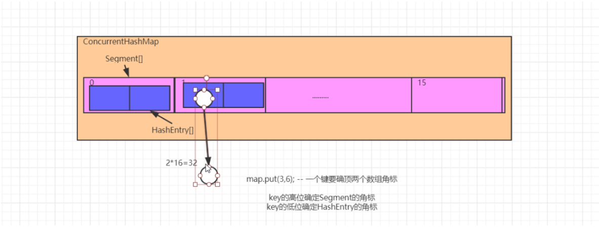 综上:ConcurrentHashMap中保存了一个默认长度为16的Segment[],每个Segment元素中保存了一个默认长度为2的HashEntry[],我们添加的元素,是存入对应的Segment中的HashEntry[]中。所以ConcurrentHashMap中默认元素的长度是32个,而不是16个