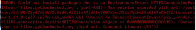 2.再分别执行: pip --default-timeout=100 install -U pip和pip --default-timeout=100 install -U tensorflow