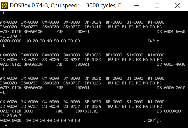 -a mov ax, 20 mov ds, ax mov ss, ax mov sp, 30 push [0] ; 执行后,寄存器(sp) = 002Eh push [2] ; 执行后,寄存器(sp) = 002Ch push [4] ; 执行后,寄存器(sp) = 002Ah push [6] ; 执行后,寄存器(sp) = 0028h pop [6] ; 执行后,寄存器(sp) = 002Ah pop [4] ; 执行后,寄存器(sp) = 002Ch pop [2] ; 执行后,寄存器(sp) = 002Eh pop [0] ; 执行后,寄存器(sp) = 0030h