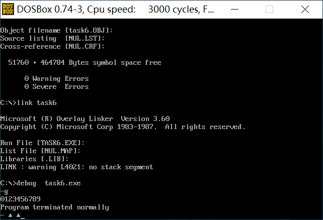 (2)使用masm、link对程序汇编链接过程截图,以及,运行可执行程序task5.exe的运行结果截图